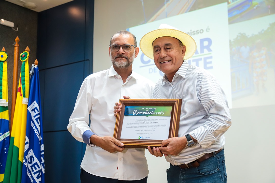 Para finalizar a programação, o coordenador Carlos Afonso entregou um certificado de reconhecimento ao prefeito Tião Bocalom destacando sua atuação em favor da construção civil.