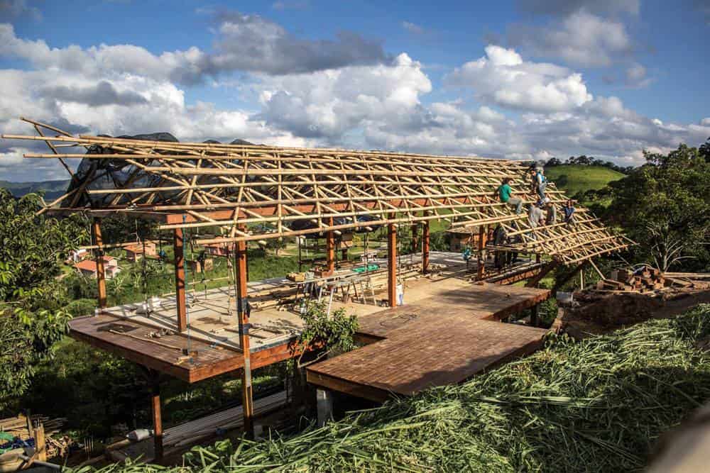 Considerado uma fonte renovável, o bambu é um dos materiais mais inovadores na área da construção. É resistente o suficiente para substituir o aço em algumas estruturas, como mostram construções em países como China, Japão e Indonésia. Na América do Sul, o país mais desenvolvido no seu uso é a Colômbia, como atesta a catedral Alterna Nuestra Señora de La Pobreza, projetado pelo renomado arquiteto Simón Velez. “Diferente do cimento, que é altamente poluente, o bambu é um recurso natural que não se esgota, desde que cortado corretamente”, afirma Bruno, que está executando a armação em arco de bambu gigante de uma casa na Ecovila Clareando, como mostra a foto acima.