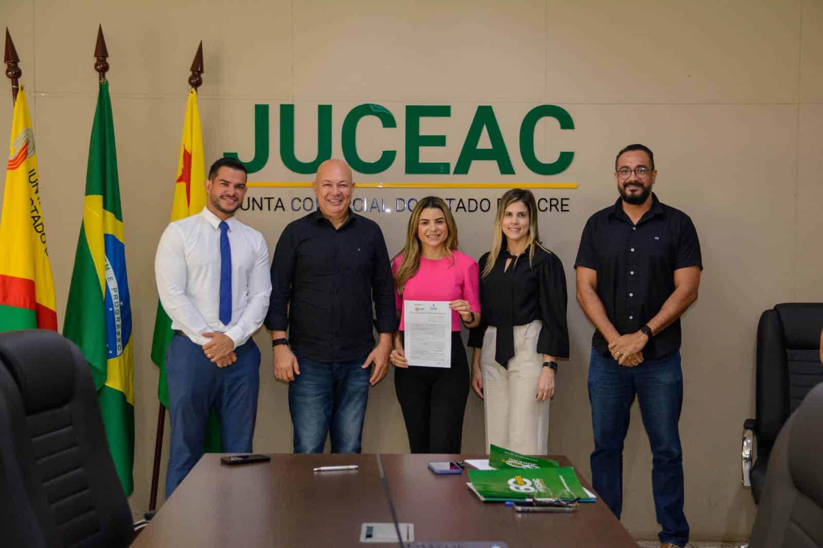 O Fórum Empresarial de Inovação e Desenvolvimento do Acre e a Junta Comercial do Acre (Juceac) firmaram parceria para disponibilização de dados e informações para o levantamento de estudos e pesquisas. Nesta sexta-feira, 12, foi realizada a assinatura do termo de cooperação técnica entre o presidente do Fórum, José Adriano, a presidente da Juceac, Nayara Honorato, a coordenadora do Fórum, Tíssia Veloso, e o procurador jurídico da autarquia, Cristopher Mariano.